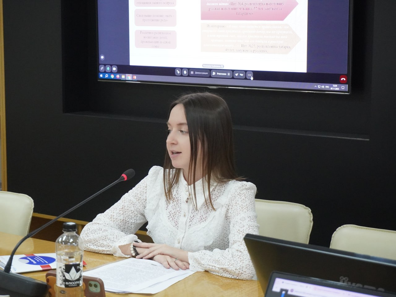 В рамках работы секции "Межпоколенческий диалог в современном обществе: возможности, перспективы и вызовы" с докладом на тему "Роль старшего поколения в передаче традиций детям в межэтнических семьях" выступила м.н.с. Татьяна Клячина. Она представила результаты комплексного исследования межэтнических браков в Татарстане.