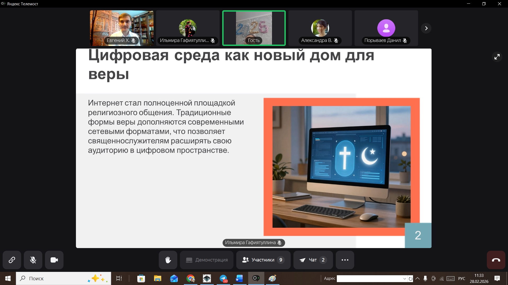 Н.с. Ильмира Гафиятуллина выступила с докладом на тему «Проповедь в интернете: тренды, погоня за лайками и образ священнослужителя» в рамках секции «Религиозная идентичность в цифровую эпоху». В частности, она отметила ряд общих трендов и специфических особенностей проповеди в интернете, представив собственный анализ влияния погони за вовлеченностью на содержание проповедей и трансформацию образа священнослужителя в глазах аудитории.